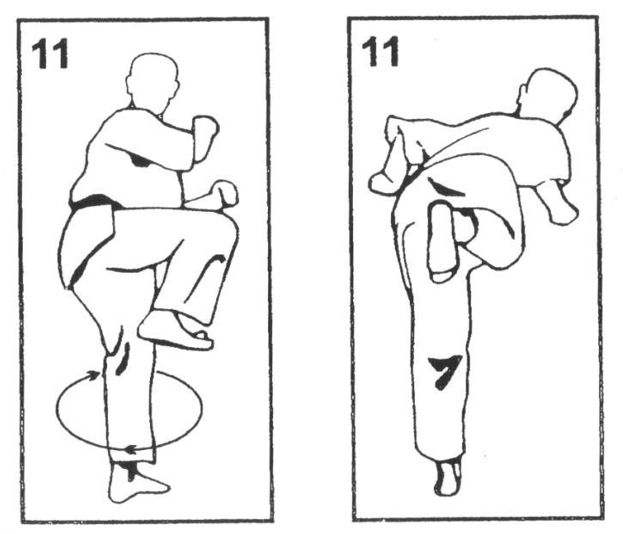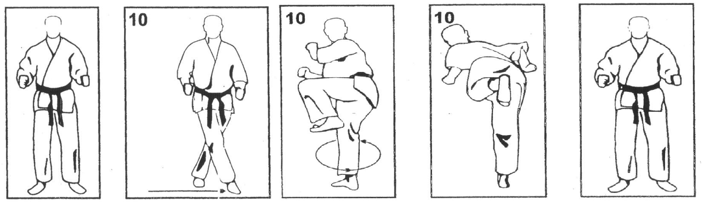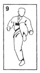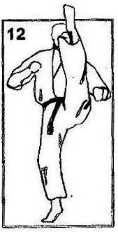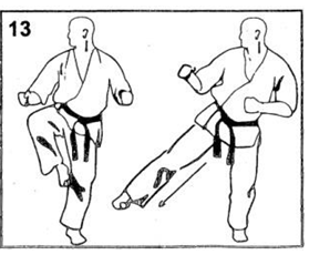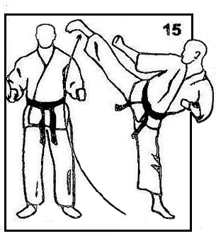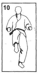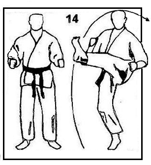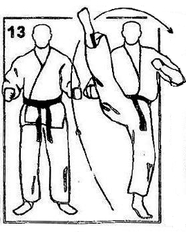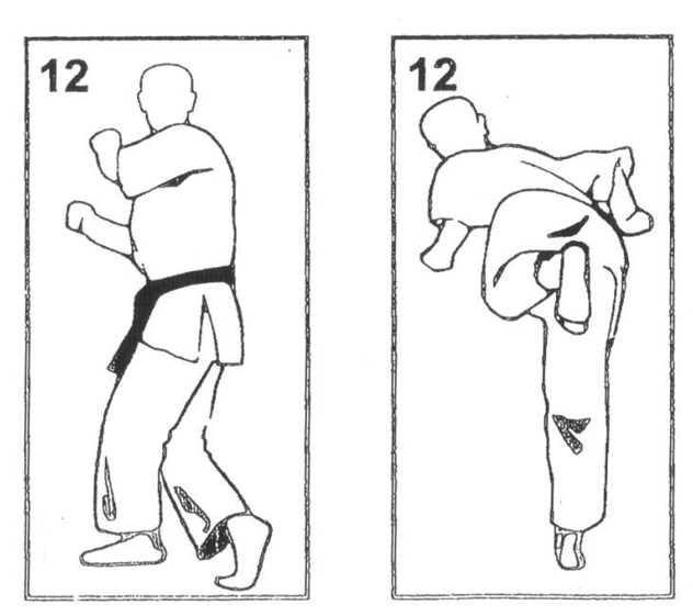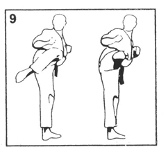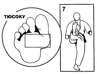 Выполняется удар подушечками пальцев ноги в солнечное сплетение (тюдан) или в голову (дзедан).