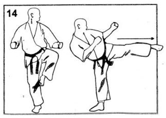 Йоко гэри тюдан сокуто (Йоко - всторону, гэри - нога, тюдан - средний уровень, сокуто - ударная часть стопы (ребро стопы))